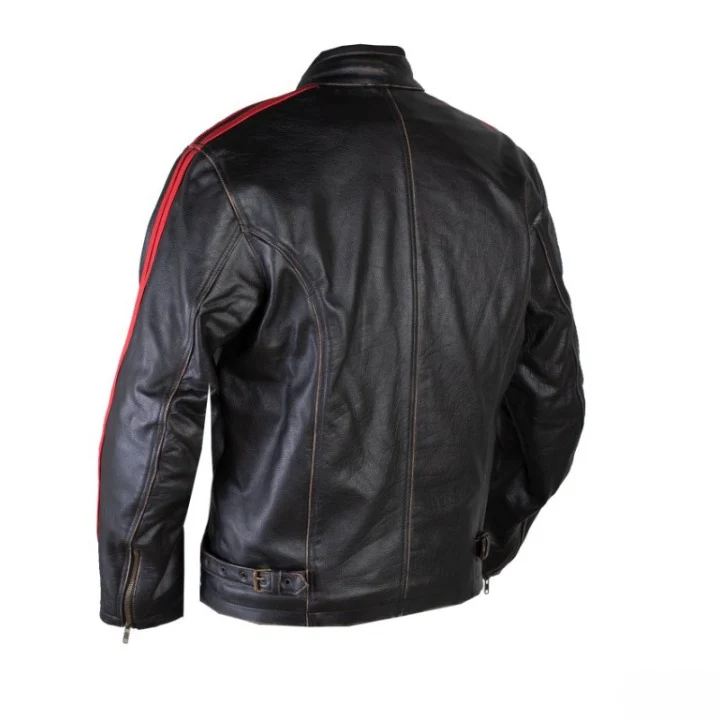 stand out on the road with this men’s black leather motorcycle jacket featuring bold red racing stripes for a striking biker look. crafted from high-quality cowhide leather, this jacket combines durability, comfort, and style in one package. designed with abrasion resistance and reinforced stitching, it provides maximum protection during rides. the sporty red double stripe detailing on the sleeves adds a unique, retro-inspired touch, making it perfect for cafe racer enthusiasts and street riders alike. it includes multiple zippered pockets for secure storage, a strong front zipper closure, and a snap-button collar for extra safety and comfort. adjustable cuffs and waist ensure a customized fit, while ventilation panels help regulate airflow during long rides. ideal for both casual wear and motorcycle touring, this jacket balances fashion with functionality, keeping riders safe and stylish wherever the road takes them.