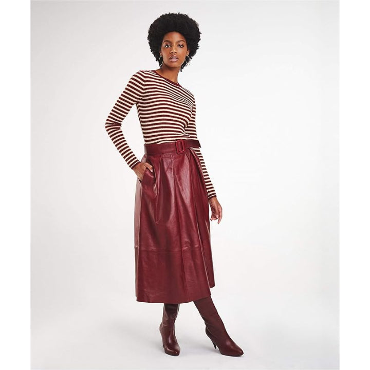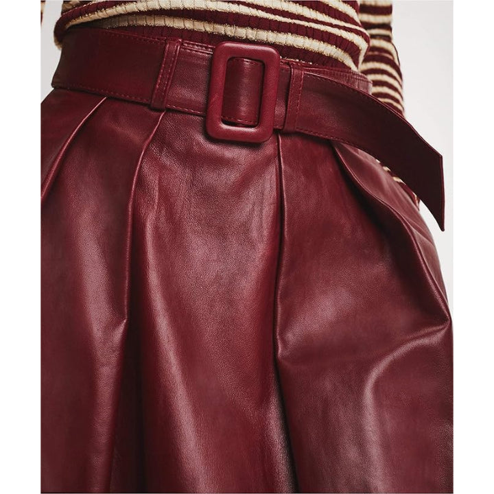 Add sophistication and elegance to your wardrobe with this Genuine Leather A-Line Midi Skirt. Crafted from soft, premium genuine leather, this skirt offers a luxurious feel and high-quality finish.The flattering A-line silhouette fits snugly at the waist and gently flares toward the hem, creating a graceful drape that complements any body shape. Its midi-length hem falls below the knee, delivering a timeless, versatile style suitable for professional, casual, or evening outfits.An integrated self-leather tie belt cinches the waist to enhance your figure and create a defined, polished look.