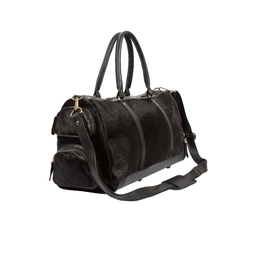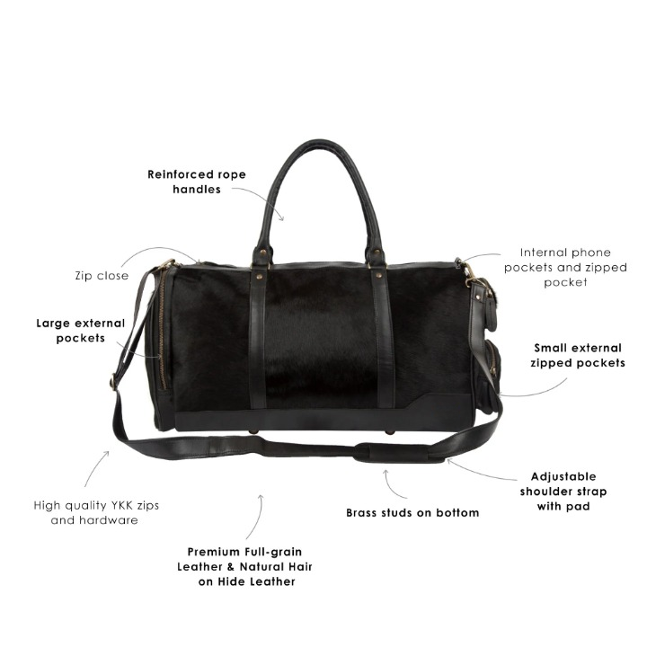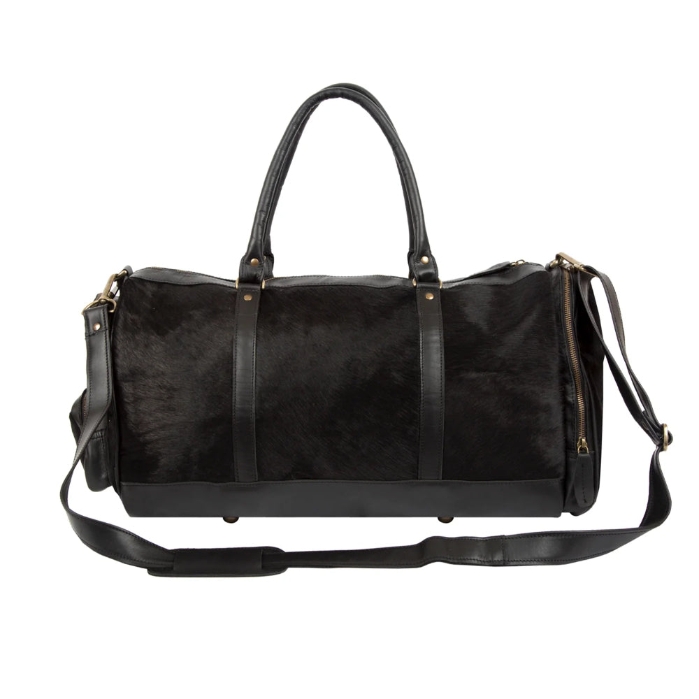 Travel in understated luxury with this Black Cowhide Leather Duffle Bag, crafted from 100% pony hair leather with a soft cotton-lined interior. With a 39L capacity, this all-black weekender holdall combines sleek style and practical functionality for the modern UK traveller.