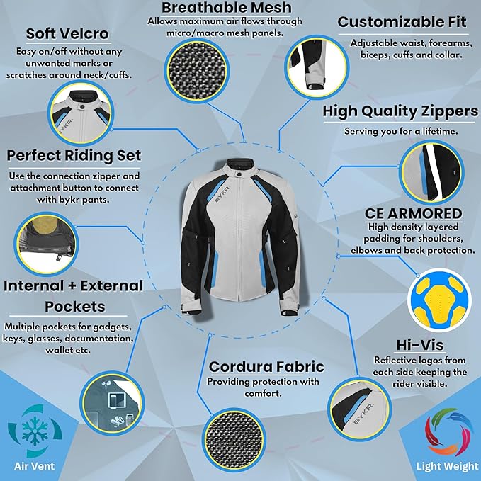 Ride with confidence and style in the BYKR Women’s Motorcycle Jacket, designed specifically for female riders who demand comfort, safety, and fashion. Built from durable textile fabric with reinforced stitching, this jacket delivers reliable protection while remaining lightweight and flexible. The jacket features strategically placed breathable panels for airflow, making it perfect for long rides and all-weather adventures. Protective padding at key impact zones, including shoulders and elbows, enhances safety without compromising mobility. Adjustable waist and arm straps provide a flattering, tailored fit for every rider. Available in multiple stylish color accents, this jacket not only ensures road protection but also complements your unique riding style. Whether commuting, touring, or going on an adventure ride, the BYKR women’s motorcycle jacket combines safety, practicality, and modern design—making it the ultimate choice for passionate lady bikers.