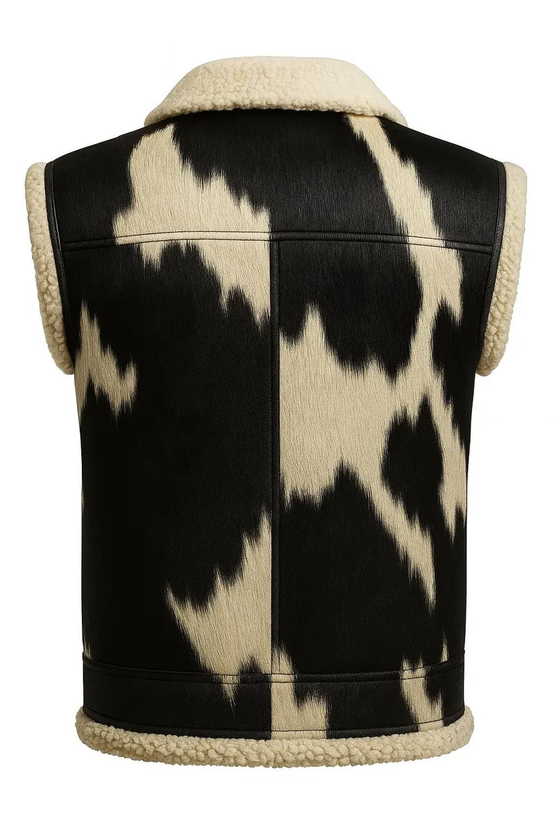 Men’s 90s Cowhide Leather Shearling Vest – Black & White Hairon Hide | Vintage Western Style Handmade Fur Lined Winter Outerwear