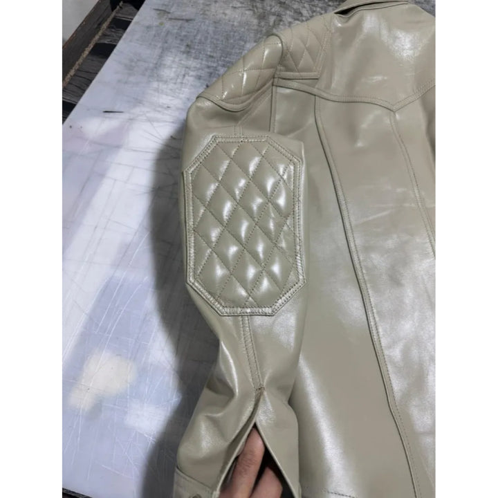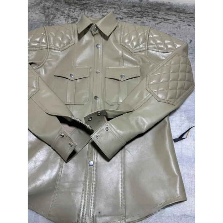 This stylish men’s leather shirt is made from real beige leather and designed to stand out. It features quilted padding on the shoulders and sleeves, giving it a cool, bold look with extra comfort. The front has snap buttons, two chest pockets, and long sleeves with snap cuffs for easy wear. The soft leather feels smooth and strong, perfect for parties, clubs, or casual outings. You can wear it as a shirt or a light jacket. It’s handmade with care and attention to detail, making it both fashionable and durable. Available in different sizes, and we also accept custom orders to fit you just right.