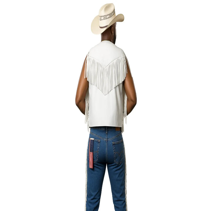 Command attention with our Men’s White Leather Fringe Vest, the perfect fusion of Western cowboy heritage and modern statement style.Crafted from 100% genuine cowhide leather, this vest captures the bold spirit of the rodeo while adding a refined, fashion-forward twist.Featuring long leather fringe detailing, a classic V-neck cut, and snap-button front, ideal for rodeo events, country festivals, stage performances, or standout streetwear looks.