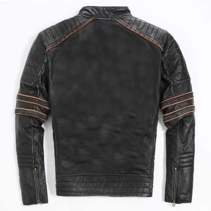 crafted for riders who love classic biker fashion with a modern twist, this men’s black cafe racer leather jacket features bold orange stripes across the arms for a standout look. constructed from high-quality genuine leather, it delivers both durability and style, making it perfect for motorcycle enthusiasts and casual wearers alike. the padded shoulders and ribbed detailing add an extra edge while ensuring enhanced comfort and protection on rides. zippered chest and side pockets provide practical storage for small essentials, while the smooth front zip closure with snap-button collar gives it a secure fit. designed for versatility, this jacket transitions easily from the road to everyday streetwear, giving you rugged confidence wherever you go.