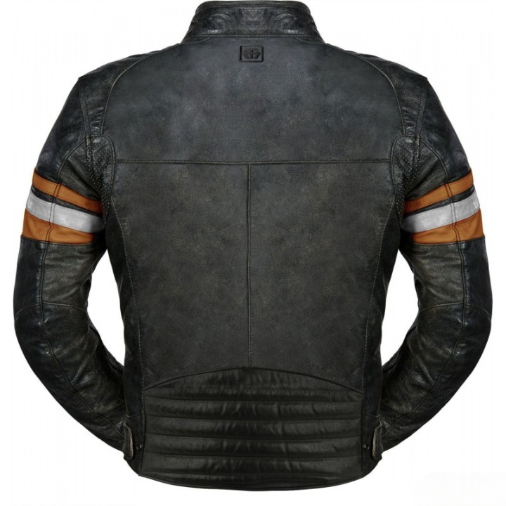 mens black leather motorcycle jacket with orange white stripes cafe racer biker riding gear protective moto streetwear retro style coat