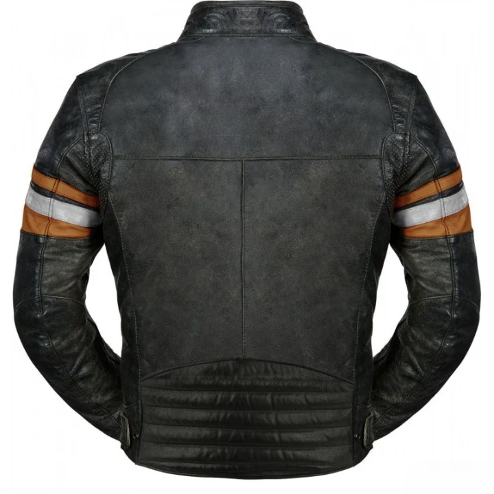 Mens black leather motorcycle jacket with orange white stripes cafe racer biker riding gear protective moto streetwear retro style coat