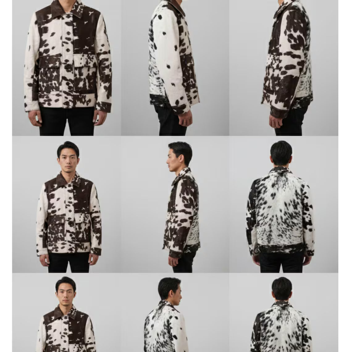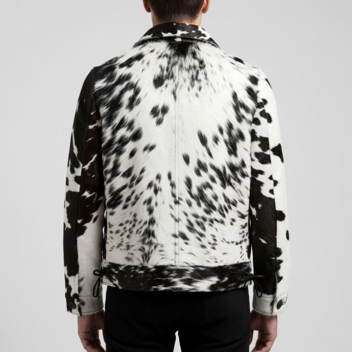 Each jacket has a unique black and white cow natural skin