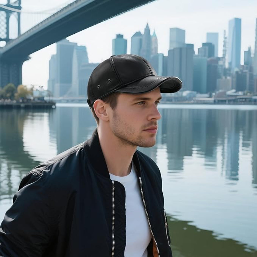 Handmade Black Leather Baseball Cap. Made from 100% genuine sheepskin or lambskin leather, it delivers exceptional softness, lightweight comfort, and lasting durability. The classic six-panel design with a pre-curved brim provides timeless style and effective sun protection. Featuring an adjustable back strap with a metal buckle or Velcro, it ensures a perfect fit for men and women. Durable, water-resistant, and carefully stitched, this cap is a premium accessory for fashion-conscious buyers in the UK.